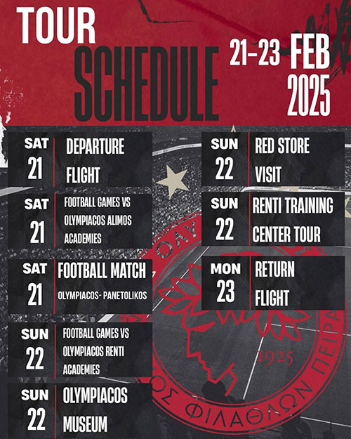 Trip to official OLYMPIACOS PIRAEUS at 21-23 February 2026, for OLYMPIACOS SOCCER SCHOOLS CYPRUS.
