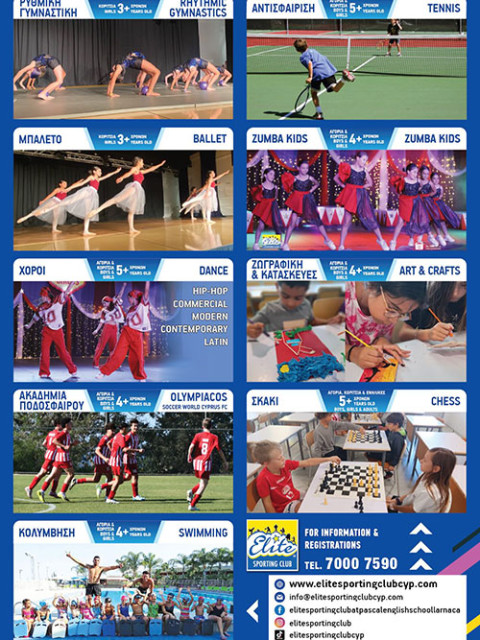 SPORTS & ACTIVITIES at ELITE SPORTING CLUB LARNAKA (at PASCAL SCHOOL premises). SPORTS & ACTIVITIES offered after school, for children 3-18yo, from September to June: 1. Football (SOCCER WOR...